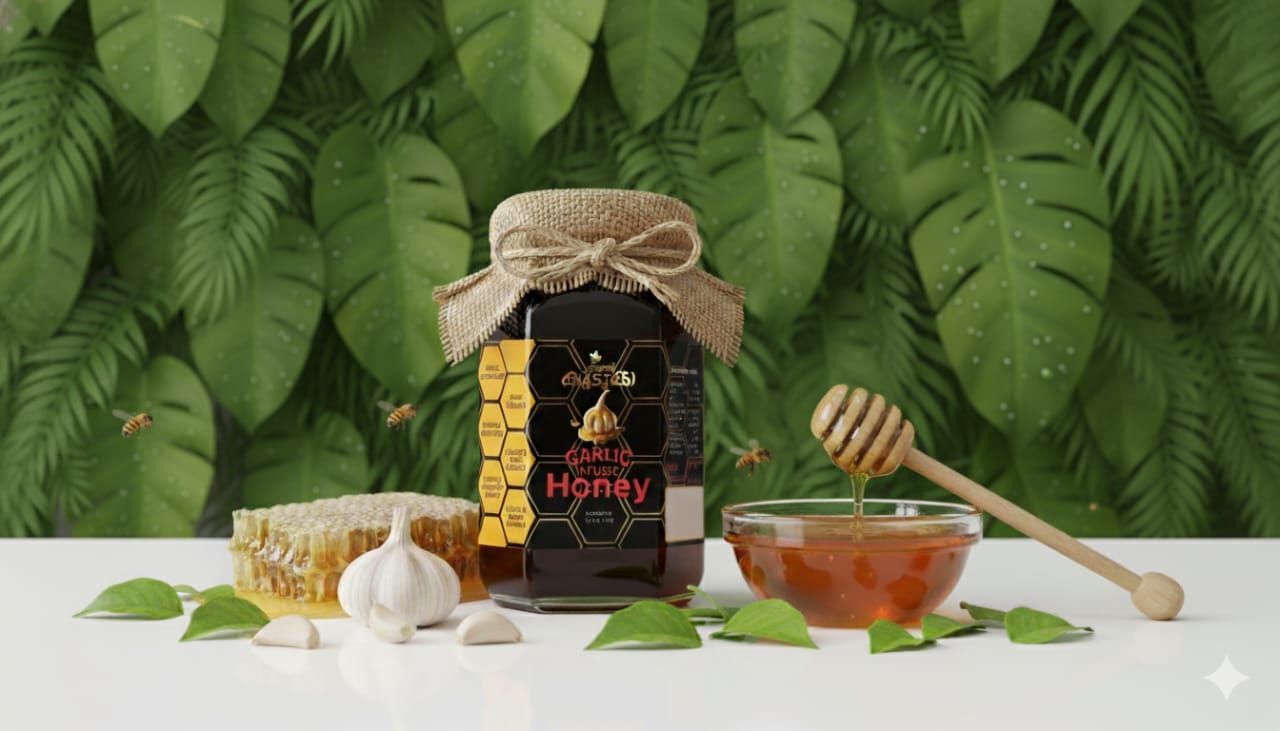 Infused garlic honey is a fermented preparation made by submerging raw garlic in honey, creating a sweet, savory, and pungent condiment known for its traditional immune-supportive and antimicrobial properties.
